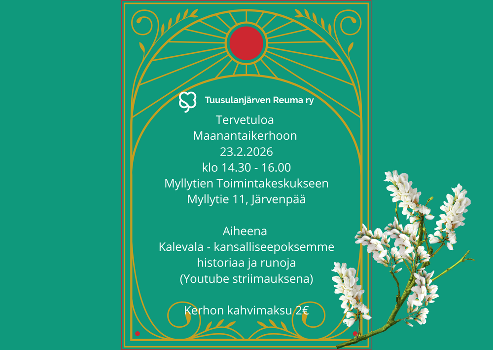 Myös meillä Tuusulanjärven Reumassa kokoonnutaan aiheen äärelle keväällä neljä kertaa keskiviikkoisin. Hyvinvointia aktiivisesta arjesta -tapaamisissa aiheina mm. reuma-sairaudet ja liikkuminen. Lue lisää ja ilmoittaudu mukaan!