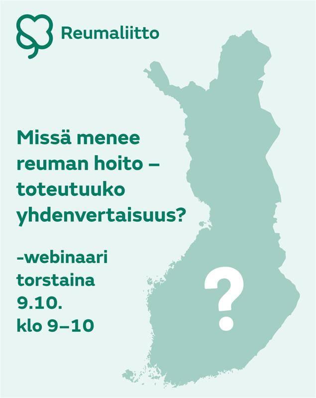 Missä Suomessa mennään reumanhoidossa? Tule kuulemaan tuoreet tulokset Reumaliiton valtakunnallisesta kyselystä (n=3490) Reumaviikon webinaariin. Aika: Torstai 9.10. klo 9–10 Paikka: Striimaus, linkki…
