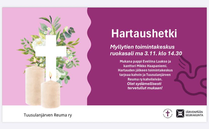 Maanantain 3.11. kerhossa Toimintakeskuksen salissa Pyhäinpäivän hartaus, mukana Järvenpään seurakunnasta pappi Eveliina Laakso ja kanttori Mikko Haapaniemi. Tilaisuuden järjestää yhteistyössä…
