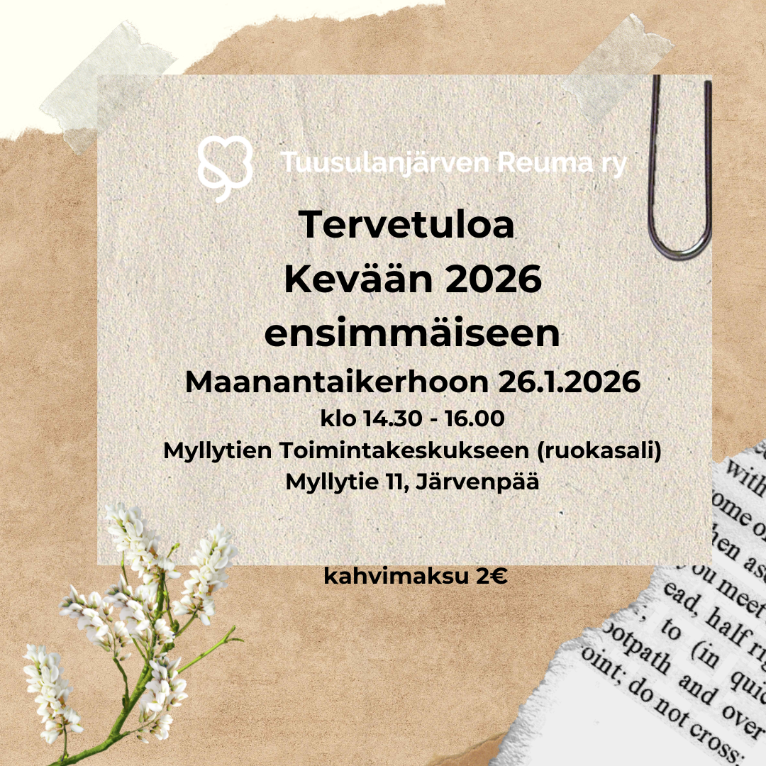 Myös meillä Tuusulanjärven Reumassa kokoonnutaan aiheen äärelle keväällä mm. neljä kertaa keskiviikkoisin. Hyvinvointia aktiivisesta arjesta -tapaamisissa aiheina mm. reuma-sairaudet ja liikkuminen. Lue lisää ja ilmoittaudu mukaan!