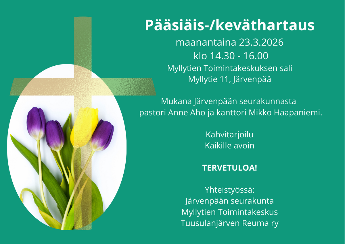 Maanantaina 23.3. klo 14.30 alkaen Toimintakeskuksen salissa yhteinen hartaushetki, mukana Järvenpään seurakunnasta pastori Anne Aho ja kanttori Mikko Haapaniemi. Tilaisuuden järjestää yhteistyössä Tuusulanjärven Reuma ry, Järvenpään seurakunta ja Toimintakeskus. Tarjolla kahvia ja kahvileipää. Kaikille avoin. Tervetuloa!