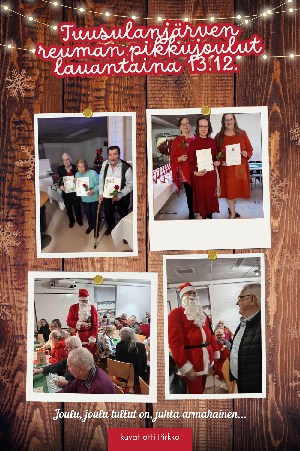 Nyt oli vauhtia ja meininkiä yhdistyksen pikkujoulujuhlissa ravintola Hermannissa Järvenpäässä. Jaettiin myöskin kunniaa vapaaehtoistyötä pitkään tehneille. Suomen Reumaliiton pronssisen ansiomerkin saivat Pirkko Holvitie, Liisa Kanninen, Tea Karpasto ja Heidi Vatka, kunniajäsenyydet Irja ja Reino Kareiselle sekä Olavi Jakobssonille. Yhdistys onnittelee lämpimästi huomionosoituksen saaneita vapaaehtoisia. Onnittelemme myös tuolijumpparyhmiemme vetäjää Anneli Utriaista stipendistä 2025, jonka Sivis on myöntänyt hänelle.
