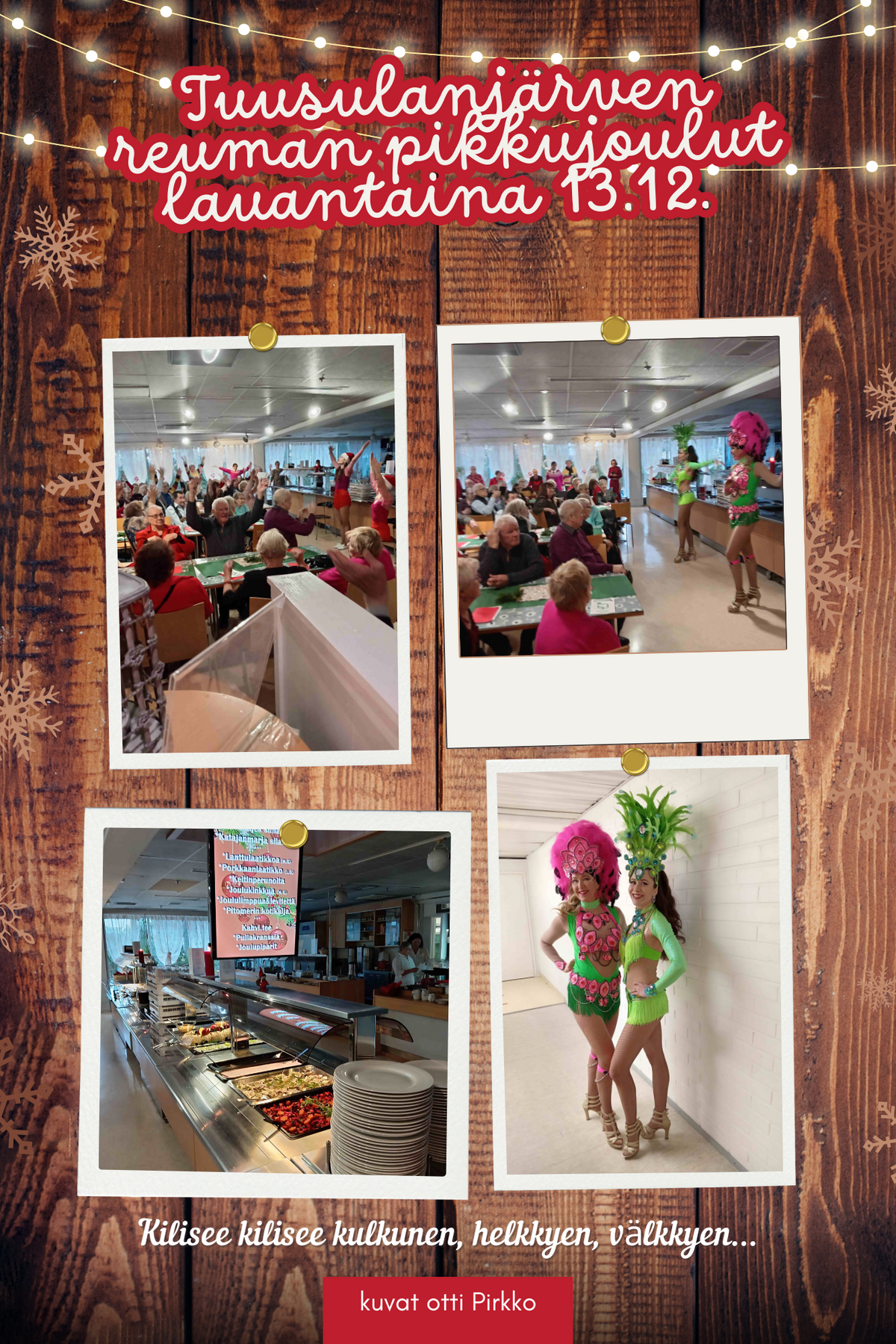 Ohjelmanumeroina sambatanssiesitys oli hieno ja sambatontut johdatti juhlaväen tuolitanssin humuun. Tietystikin se oli menestys ja sai raikuvat aplodit. Jouluruokaa ”tarjos ravintola Hermannin kunnon väki”. Mitäpä joulu olisi ilman joulupukkia, joka kävi tervehtimässä lahjojen kera. "Eläköityneen pukin" ja "noviisipukin" vuoro vaihtui mukavissa tunnelmissa. Kiitos Tenho pitkästä joulupukin pestistä!