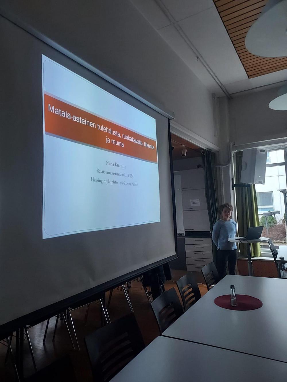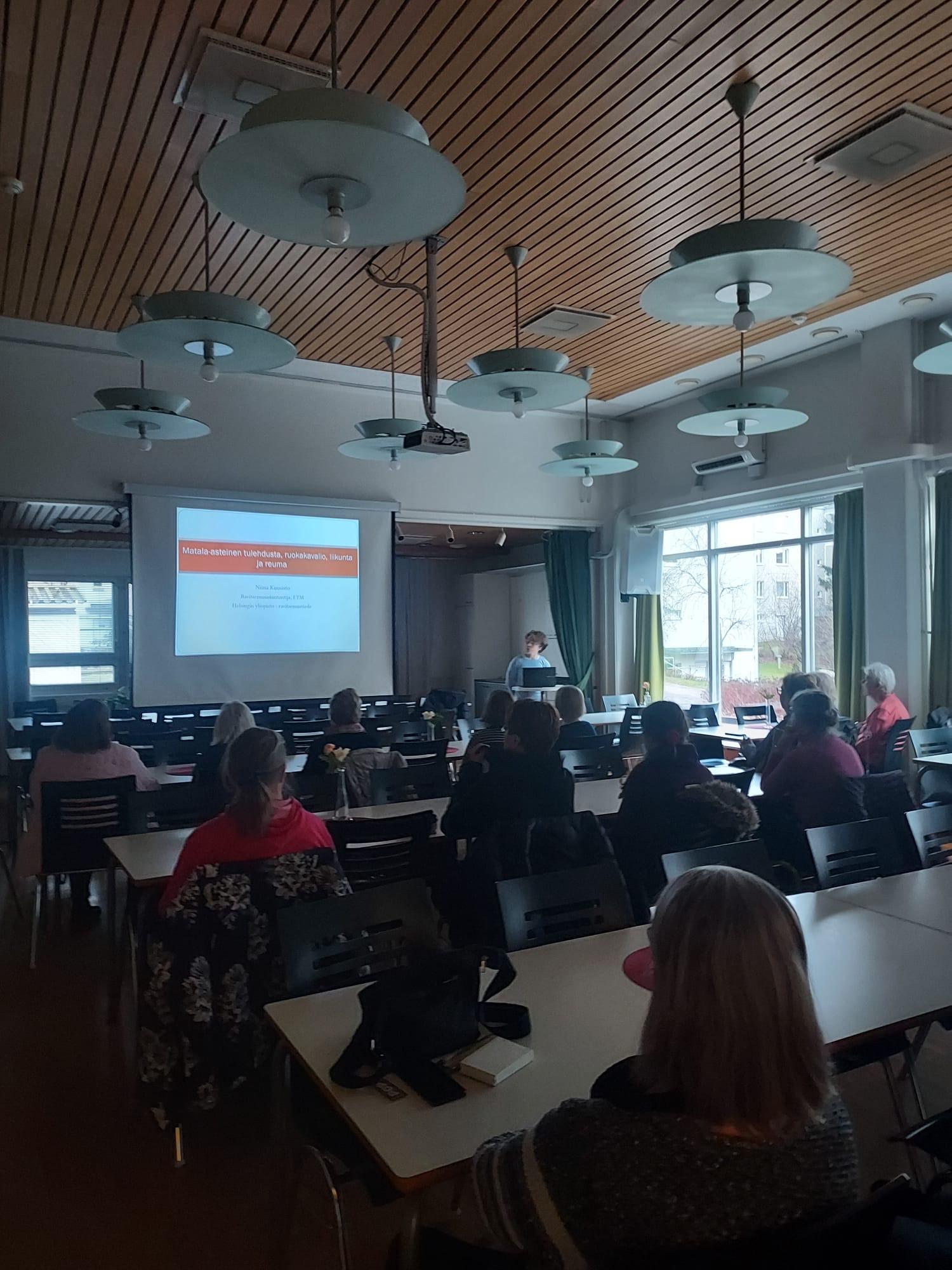 Ravitsemusluentosarjasta ensimmäinen, Matala-asteinen tulehdus ja ruokavalio keräsi tänään 17.3.2026 toimintakeskukselle joukon kiinnostuneita kuulijoita, luennoitsijana Niina Kuusisto, ravitsemusasiantuntija Helsingin yliopistosta. Paikalla olleille oli luvassa myös illan luentomateriaali toimitettuna jälkikäteen sähköpostitse.